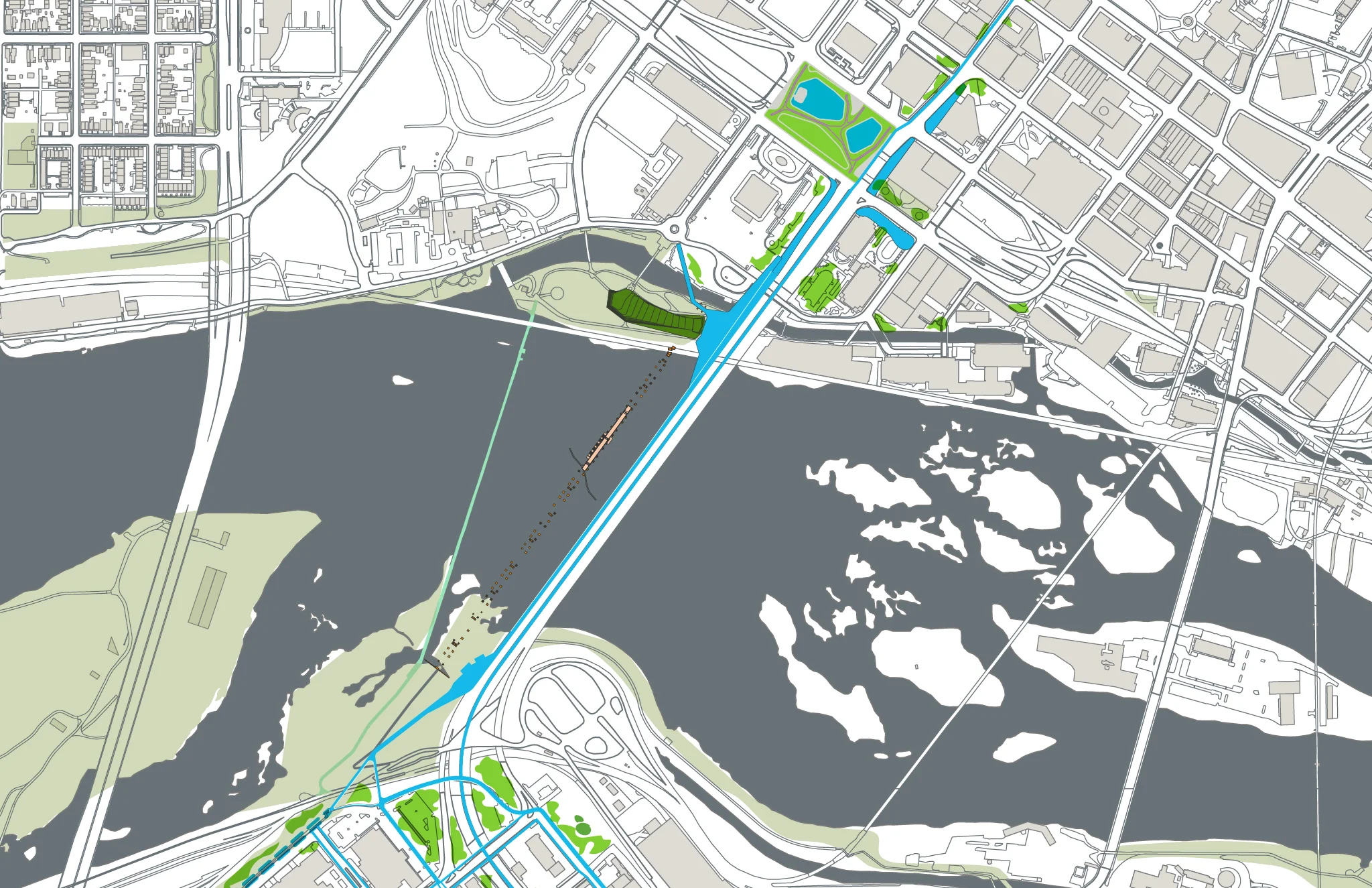 On both sides of the bridge, along a contiguous pathway, BridgePark seeks to repurpose currently barren and oversized vehicular infrastructure for non-vehicular use, including active green spaces, tree-lined walking paths, and a bicycle ‘superhighway’ from an underused median on the Manchester Bridge.